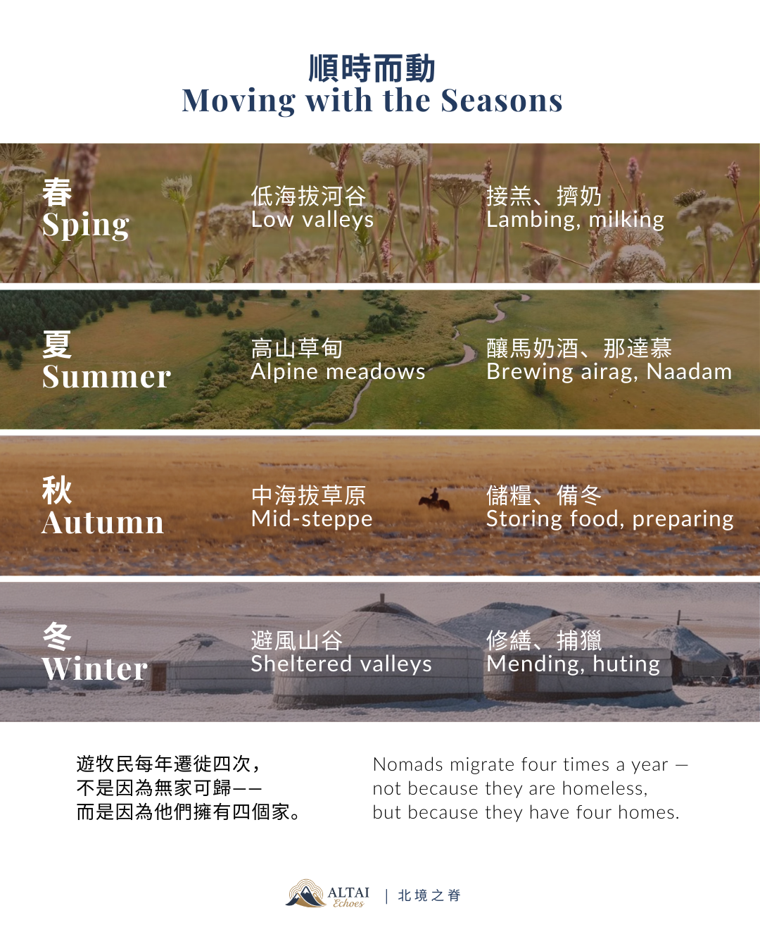遊牧民的四季哲學,提醒我們:時間不是線性的刻度,而是循環的韻律。 每一個季節都有它的任務,每一次遷徙都是一次更新。